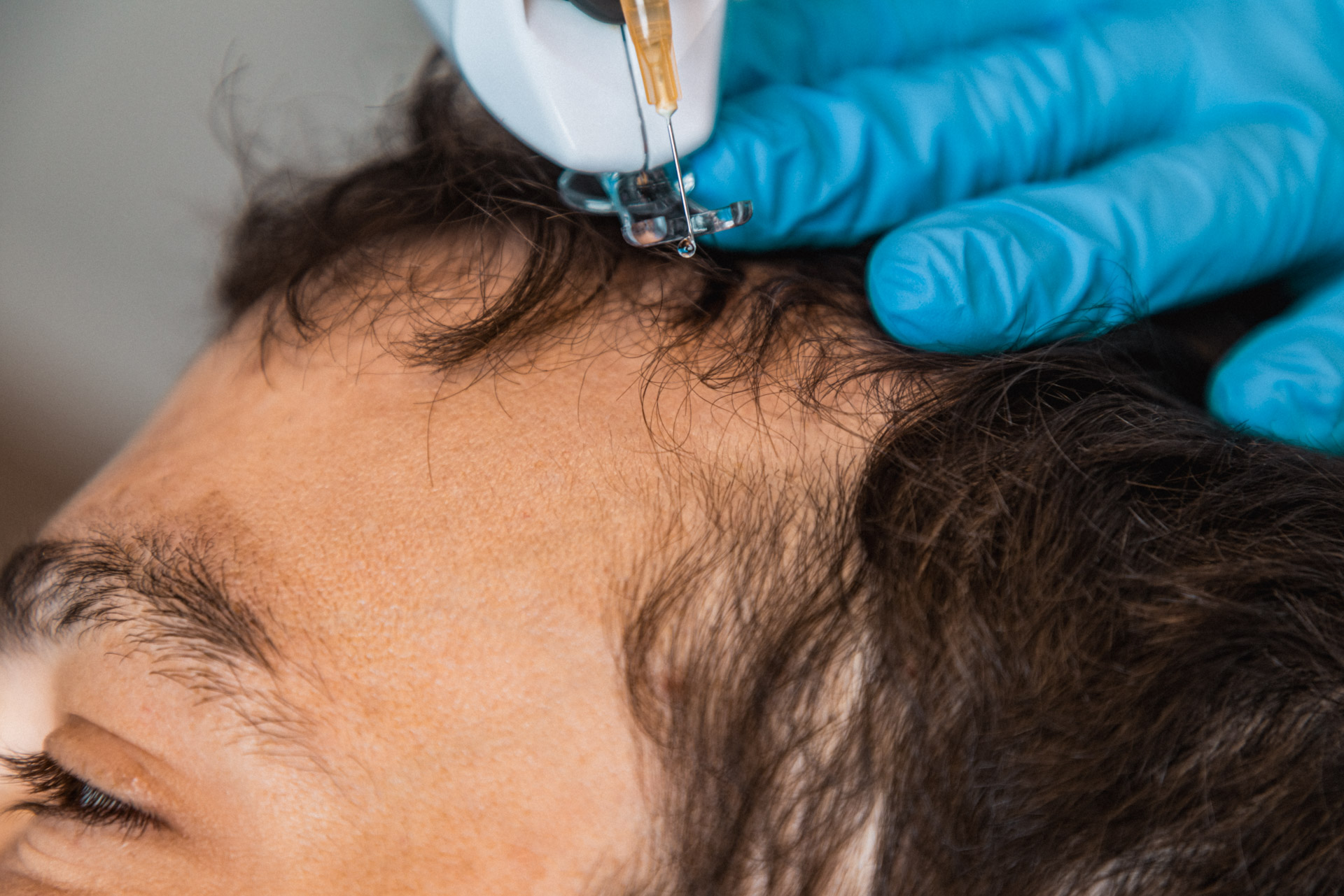 Micro-injections dans le cuir chevelu selon un protocole précis.